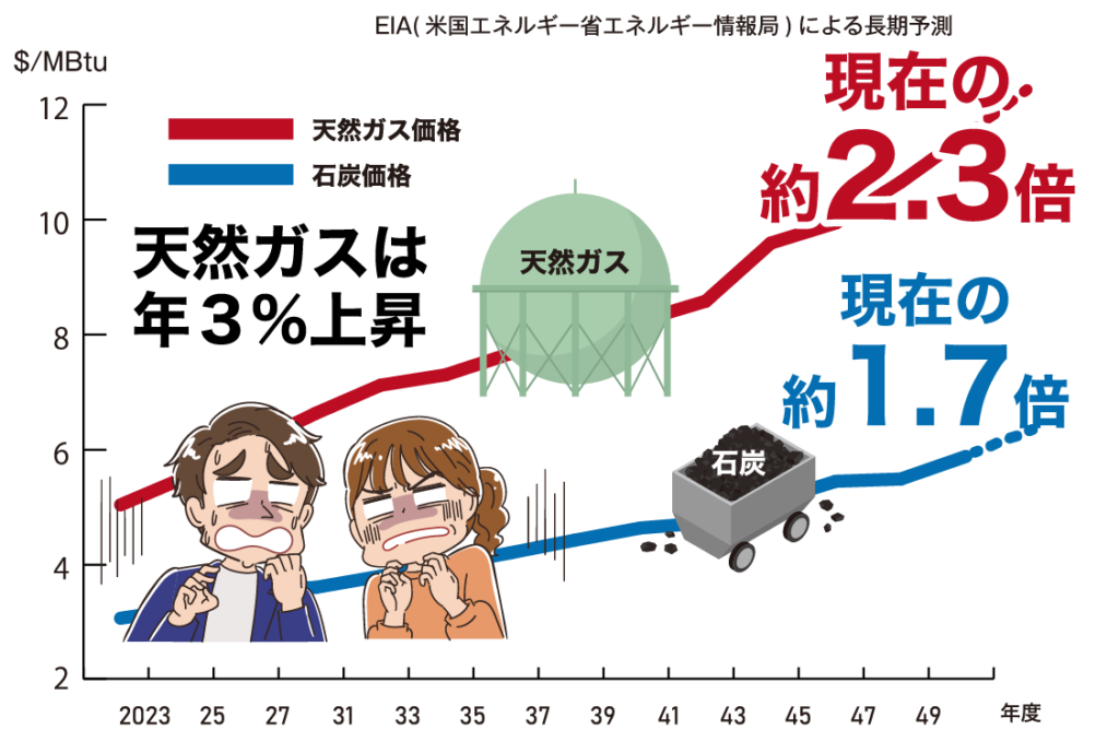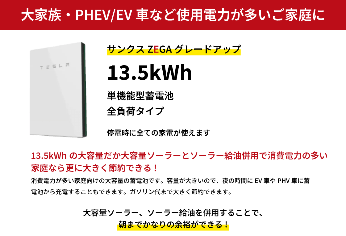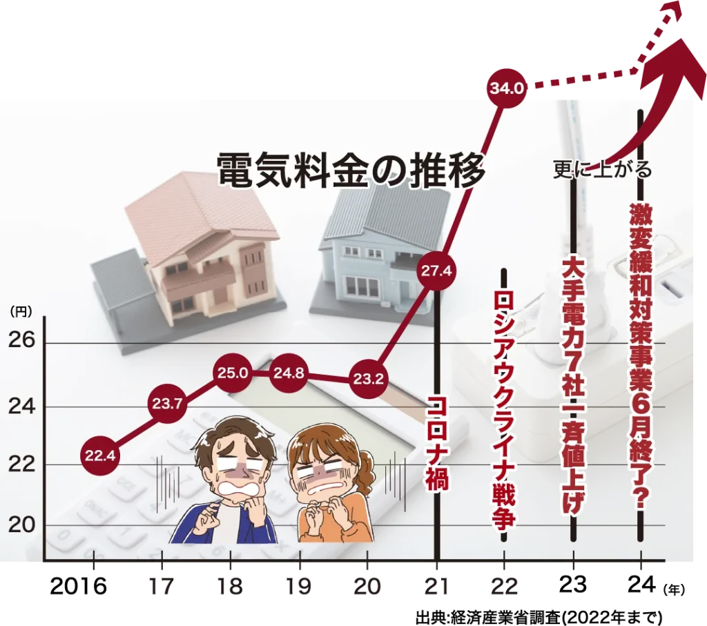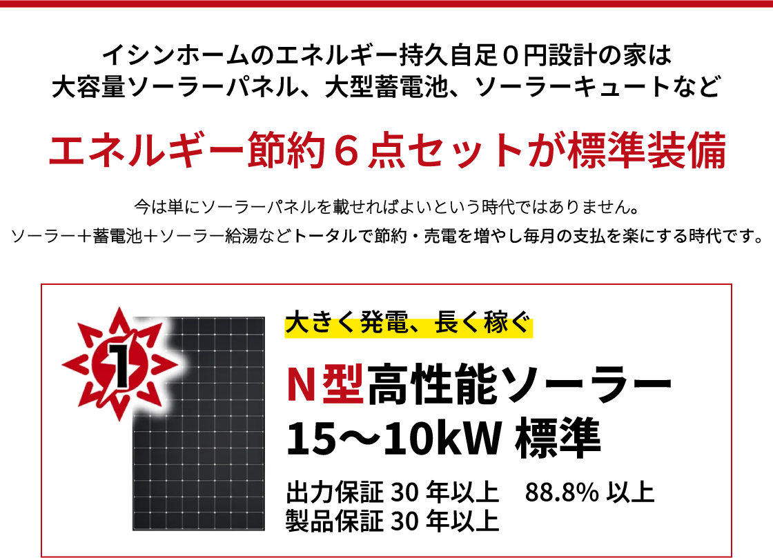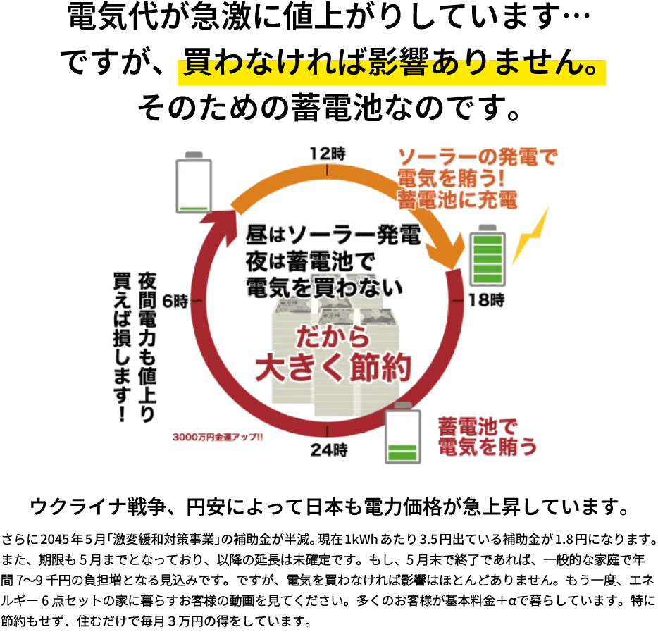 ※1.金額は設置条件、地域、家族構成、ライフスタイルなどに異なります。参考資料としてお考え下さい。オール電化、4人家族の平均光熱費1.7万円/月の50年間の光熱費累計です。中国電力のオール電化プランを基に作成しています。基本料金1650円、昼間の電気29.32円/kWh、深夜電力18.23円/kWh。値上りの計算は基本料金を除き従量部分を当初10年間は値上り無し、11-20年は120%、21-35年は150%、36-50年は200%として計算。太陽光の1kWあたり年間発電量は1252kWh/1kW。自家消費量は年間消費電力4600kWhまでは、1200kWhとして、超える部分を比率に応じて加算。ソーラーの劣化率は1-20年は100%、21-40年は95%、41-50年は93%としています。蓄電池は質容量は名目容量の80%、劣化率は当初10年間100%、11-20年70%、21年目に全固形電池買い替えて50年まで使用することとする。気象庁データから地域別に雨、雪の日を算出。蓄電池の蓄電量、購入電力に加味。※2.ガソリン単価は160円/㍑とし、値上りは揮発油税50円/㍑を除く部分を電気料金に準じて計算。ガソリン車の燃費は15km/㍑、EV車の電費は158W/1km。現在の月々のガソリン代が2万円と1.2万円の場合で予測値を算出。EV車への乗換えは10年後として計算。